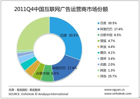 一月三十一日信息:2011Q4百度Baidu/阿里巴巴/谷歌Google目前占中國互聯(lián)網(wǎng)廣告市場份額的前三位