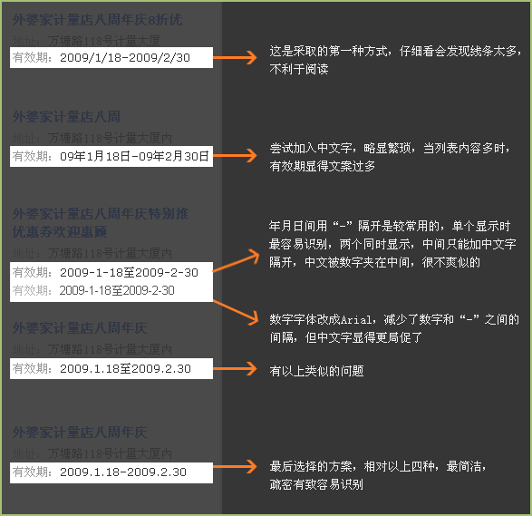 最近設計一個優惠券列表,有個屬性是有效日期,由于空間有限,必需要把開始日期和結束日期在一行顯示,這樣就泛起一排的數字,日期有好幾種我們習慣的格局,哪個更好?