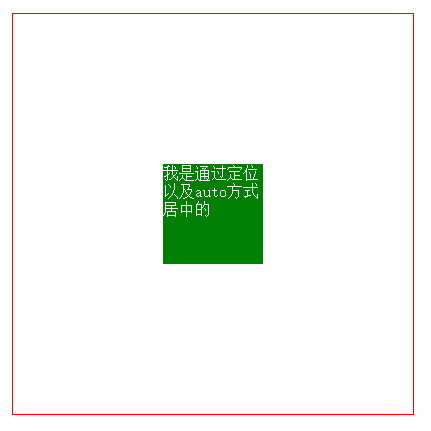<style> body{margin: 0;} .box{ width: 400px; height: 400px; border:1px solid red; position: relative; } item{ position: absolute; left: 0; right: 0; bottom: 0; top:0; margin: auto; width: 100px; height: 100x; background: green; } </style> <body> <div class="box"> <div class="item"></div> </div> </body>