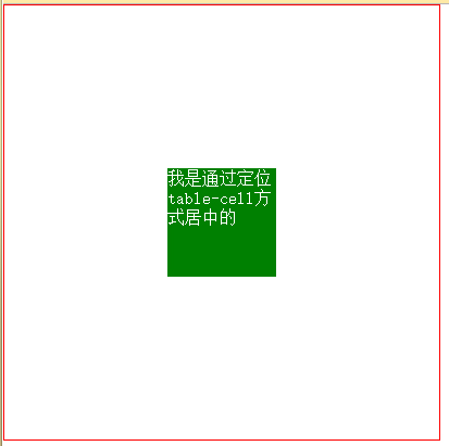 <style> body{margin: 0;} .box{ width: 400px; height: 400px; border:1px solid red; display: table-cell; vertical-align: middle; } item{ margin:0 auto; width: 100px; height: 100x; background: green; } </style> <body> <div class="box"> <div class="item"></div> </div> </body>