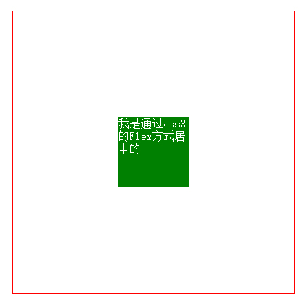 <style> body{margin: 0;} .box{ width: 400px; height: 400px; border:1px solid red; display: flex; justify-content: center; align-items: center; } item{ width: 100px; height: 100x; background: green; } </style> <body> <div class="box"> <div class="item"></div> </div> </body>